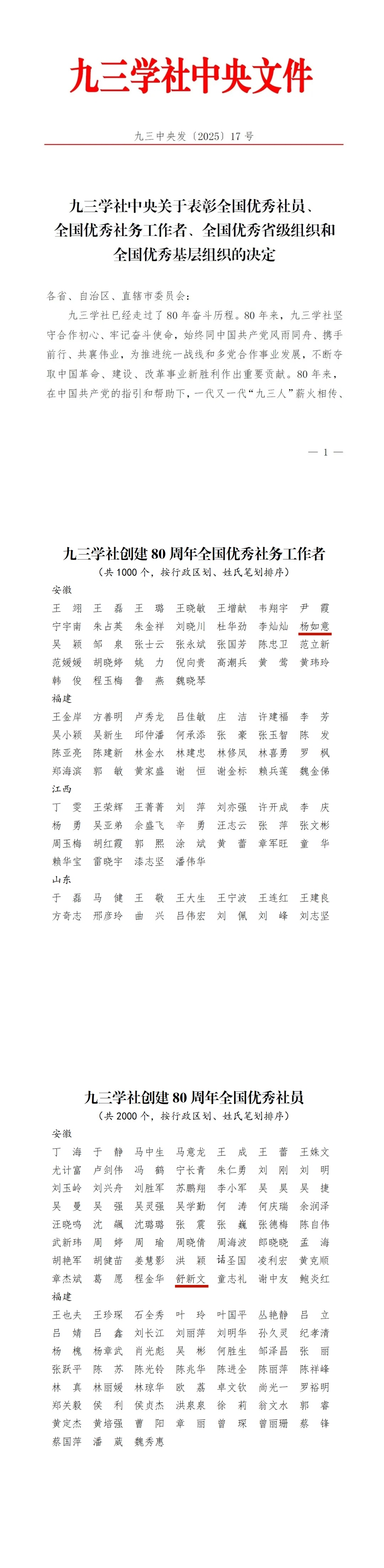 近日,九三学社中央发布《关于表彰全国优秀社员、全国优秀社务工作者、全国优秀省级组织和全国优秀基层组织的决定》(九三中央发〔2025〕17号),对在各项工作中表现突出的集体与个人予以表彰。我院杨如意教授荣获“九三学社创建80周年全国优秀社务工作者”荣誉称号,展现了我院民主党派成员履职尽责、积极作为的良好风貌。