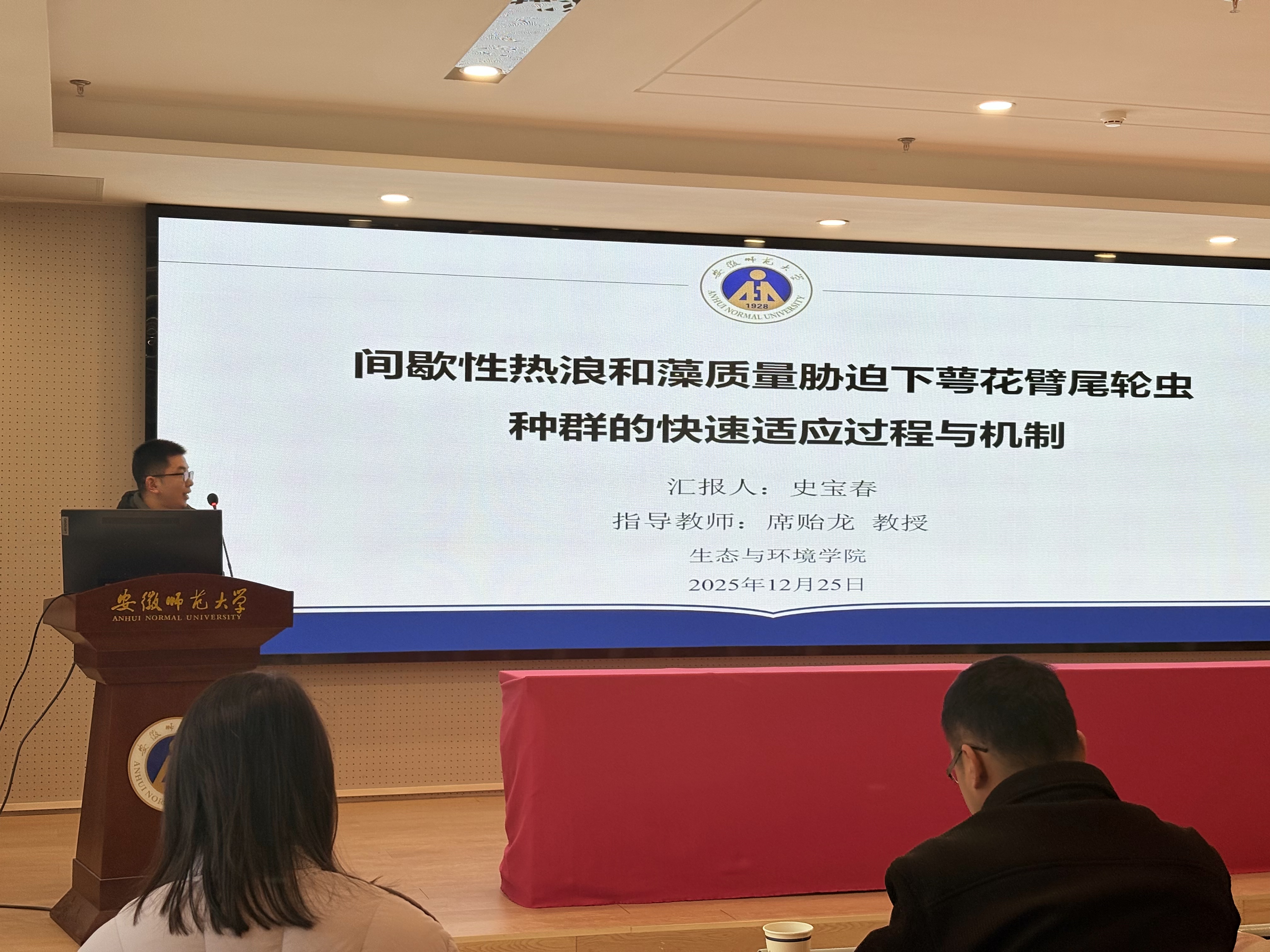博士生史宝春带来“间歇性热浪和藻质量胁迫下萼花臂尾轮虫种群的快速适应过程与机制”的报告。结合全球气候变化背景,他阐述了间歇性热浪与食物质量对萼花臂尾轮虫种群动态的影响,通过实验揭示了轮虫种群在胁迫下的快速适应过程与机制,为生态系统的稳定性研究提供了实证支持。