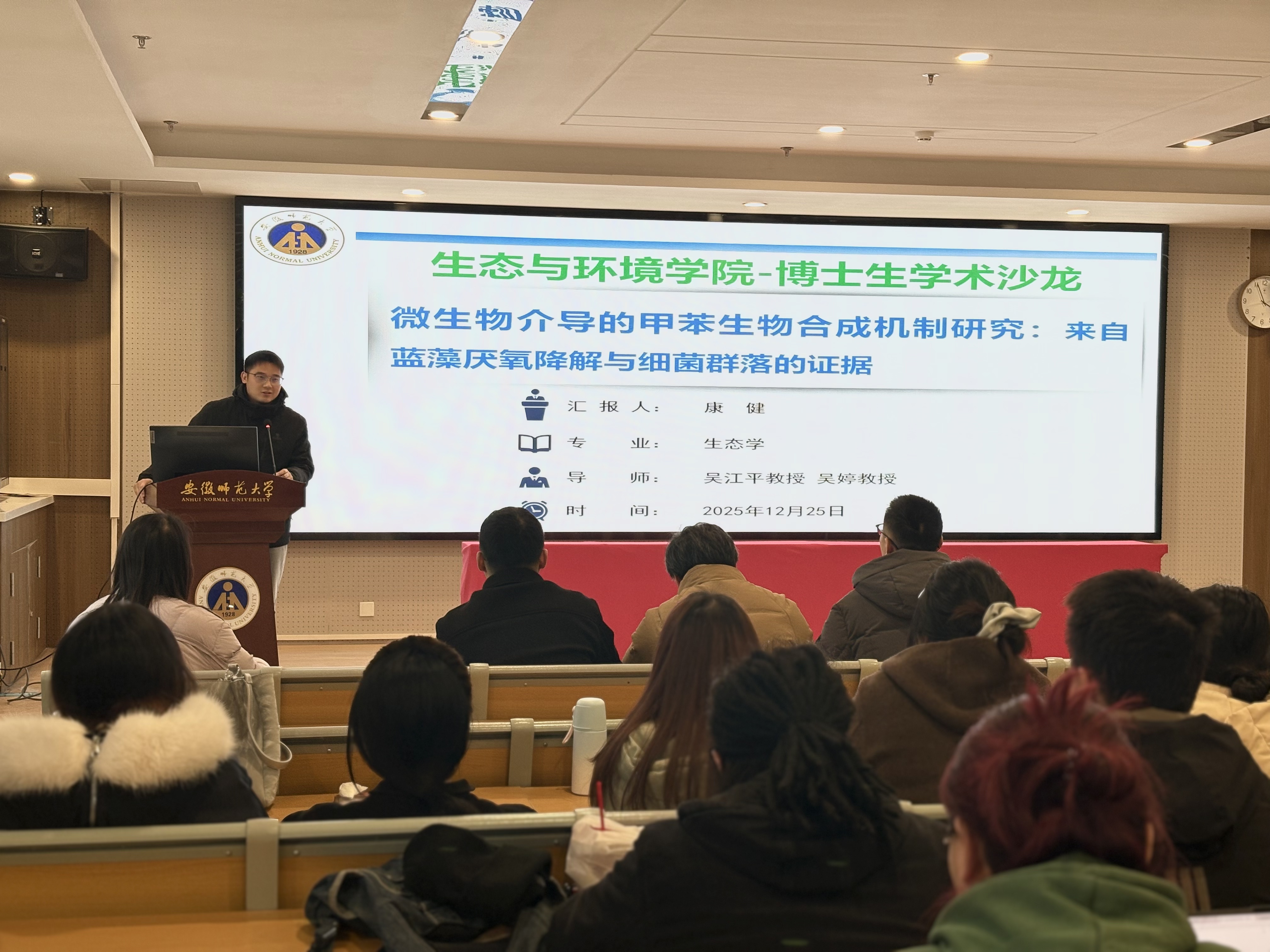 12月25日下午,由研究生院主办、生态与环境学院承办的安徽师范大学第七届博士生学术沙龙在花津校区清源楼C307会议室成功举办。本次沙龙聚焦生态与环境领域前沿研究,邀请了生态与环境学院3位博士生作学术分享,生命科学学院陈绍兴教授、生态与环境学院疏义林副教授、李明会老师担任点评嘉宾。生态学博士学位点负责人吴海龙教授出席会议,生态学专业60多名硕士和博士参加沙龙。