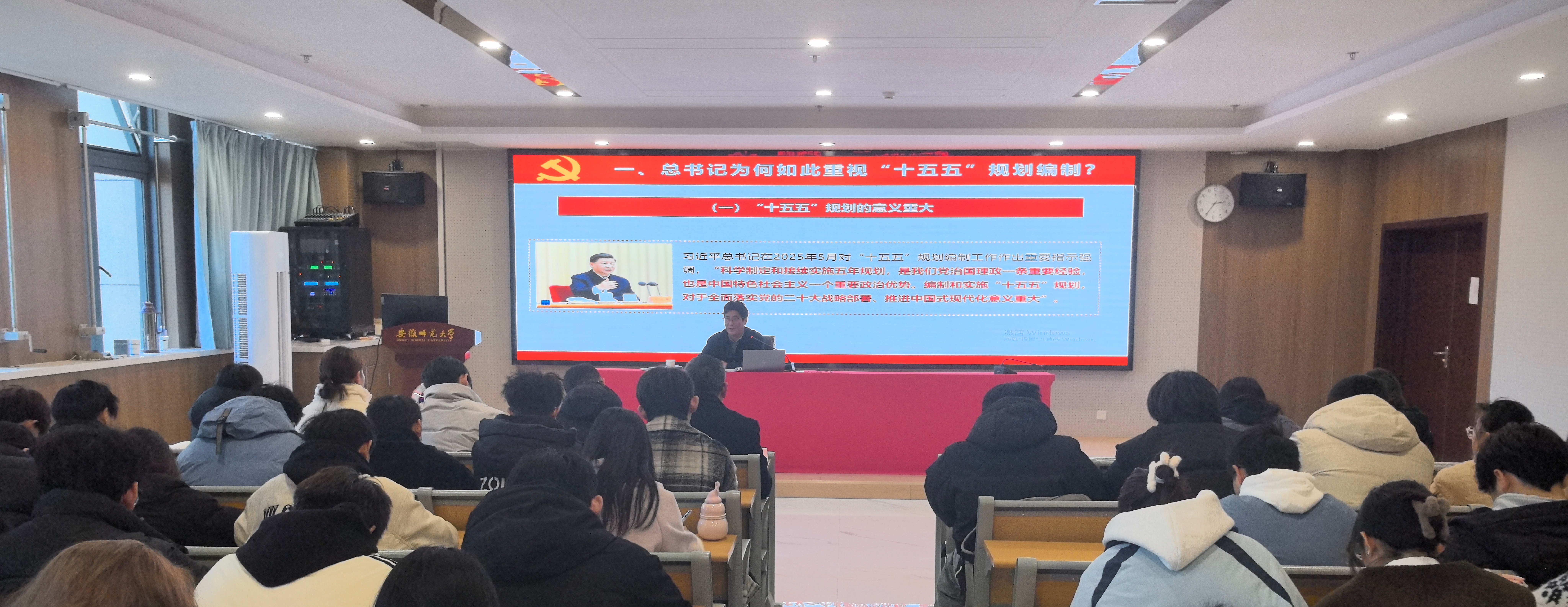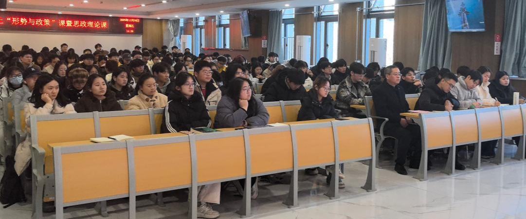 12月26日,校党委常委、副校长高峰在清源楼C307教室为学院师生讲授“形势与政策”课暨思政理论课。课程由学院党委书记张伟主持,学院160余名师生代表到场聆听。