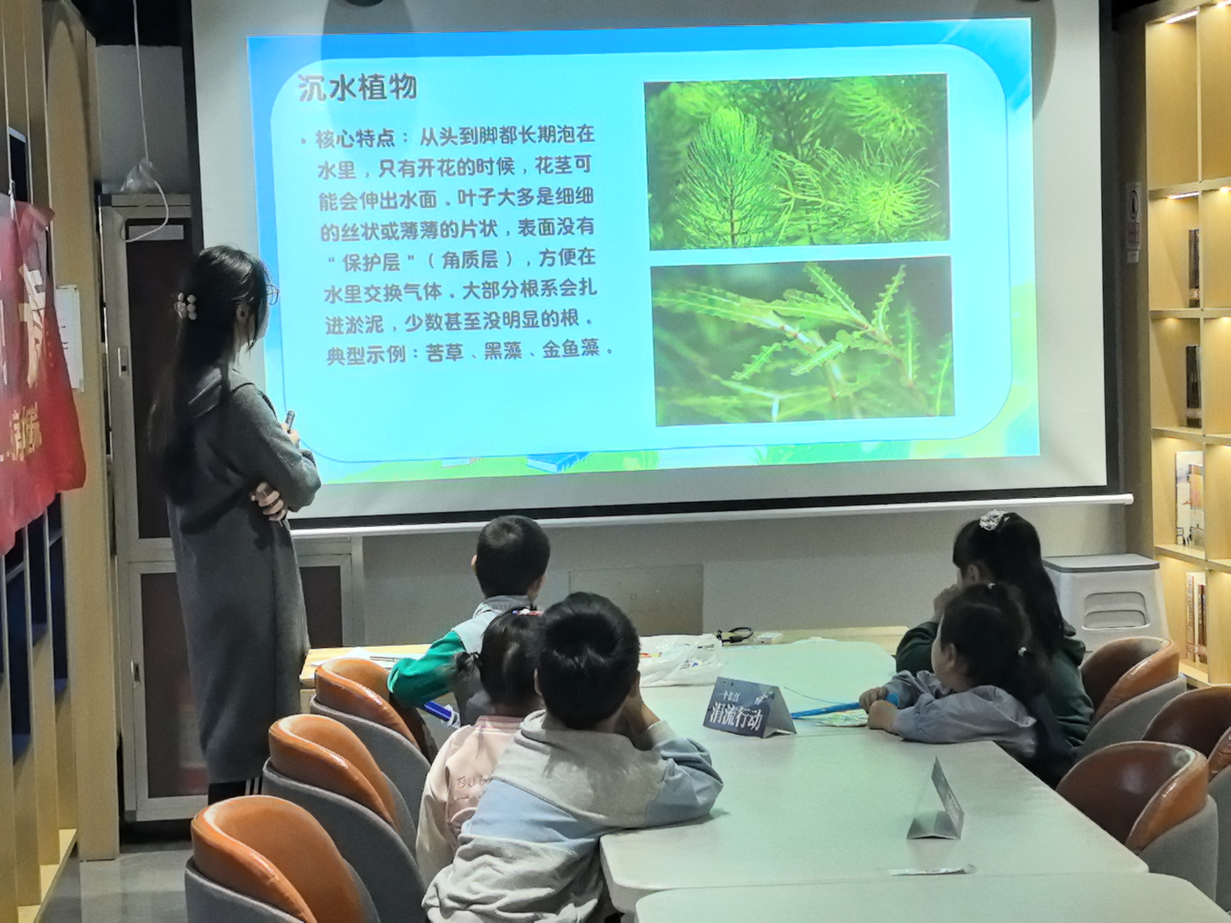 在书院开展的水生植物科普课堂上,团队成员以通俗易懂的语言和生动形象的图片,引导青少年认识水生植物这一“隐藏在水下的森林”。通过分类讲解与实例展示,孩子们逐步了解挺水、浮叶、沉水和漂浮植物的差异与功能,在观察与互动中建立起对水生植物多样性的直观认识。课堂不仅停留在讲解层面,还融入了观察、提问和动手体验等环节。显微观察、实物触摸与创意拼贴等活动,让抽象的生态概念变得具体可感。孩子们在惊叹与讨论中理解了水生植物的生存智慧,也在潜移默化中意识到保护水环境的重要意义。