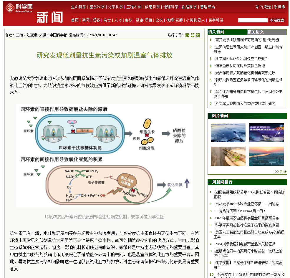 我院水生态环境团队万锐教授课题组青年教师李想博士为第一作者在环境科学顶级期刊《Environmental Science & Technology》上发表题为“Exposure to Environmentally Relevant Concentrations of Antibiotics Increases N₂O Emissions and Delays Nitrate Removal: New Insights into Bacteriostatic Antibiotics at the Cellular Level”的研究论文。近日,科学网、《安徽日报》客户端对此进行了报道。
