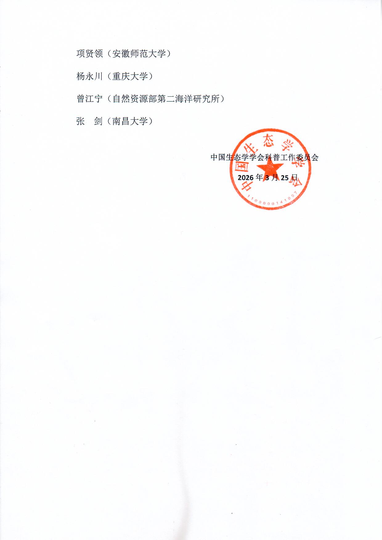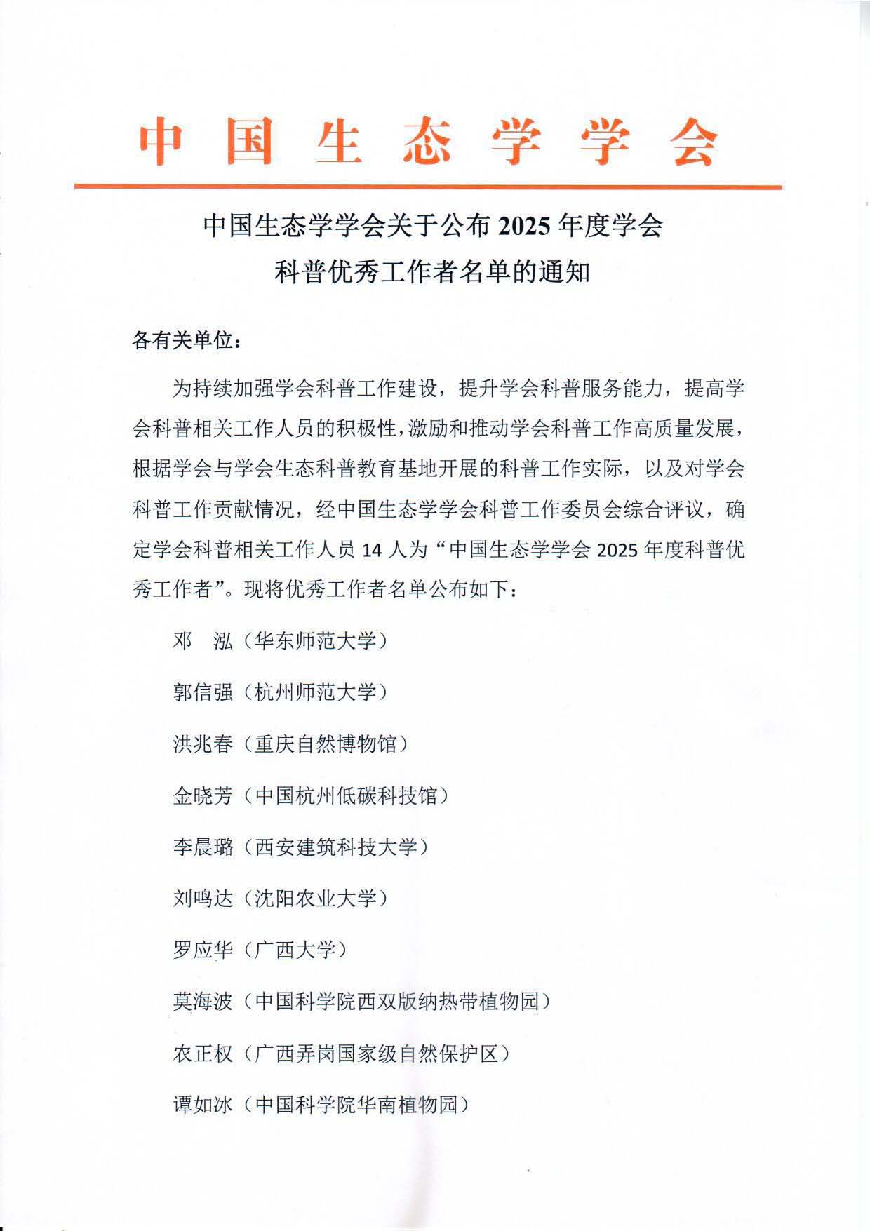 近日,中国生态学学会发布了《中国生态学学会关于公布2025年度学会科普优秀工作者名单的通知》,对在学会科普工作中表现突出的个人予以表彰。我院项贤领教授荣获“中国生态学学会2025年度科普优秀工作者”荣誉称号,展现了我院教师积极参与科普工作的良好风貌。