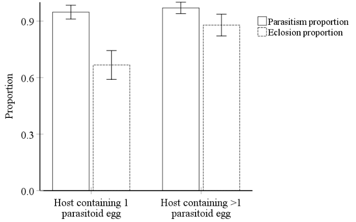 图2 含1枚或>1枚寄生蜂卵寄主中的寄生率与羽化率
