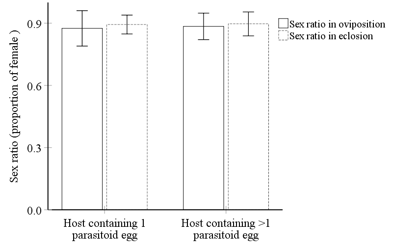图3 含1枚和>1枚寄生蜂卵寄主在产卵期和羽化期的性比