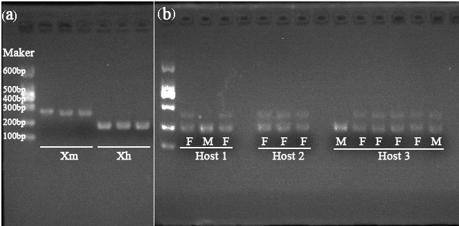 根据已有高通量测序数据,在舞毒蛾卵平腹小蜂基因组中识别潜在微卫星位点并设计特异性引物93对。通过PCR检测与凝胶电泳技术筛选鉴定出1个微卫星位点及对应引物对可以区分两个地理品系(Xm品系和Xh品系)。基于单双倍体性别决定机制,雌性卵粒的PCR产物呈杂合型双带,雄性卵粒则表现为半合型单带(图1)。
