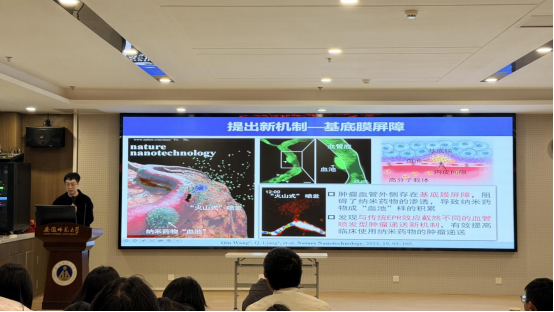 汪沁博士在讲座中首先回顾了自己在安徽师范大学的学习与成长经历,勉励学弟学妹们志存高远,及早做好学习、生活与科研发展的整体规划。随后,他系统介绍了纳米药物的基本概念、发展历程及其在肿瘤治疗中的重要作用,并重点分享了其博士期间围绕“纳米药物在体内递送机制”开展的一系列创新性研究工作。通过构建多尺度活体显微成像平台,首次发现并命名了“纳米血池”结构,揭示了基底膜是纳米药物进入肿瘤组织所面临的第二道关键物理屏障。进一步研究表明,热疗诱导的急性炎症反应可招募中性粒细胞动态打开基底膜,从而显著提升纳米药物的肿瘤递送效率。相关成果已发表于国际顶级期刊《Nature Nanotechnology》,为纳米药物的肿瘤递送提供了重要的理论依据与新的技术路径。